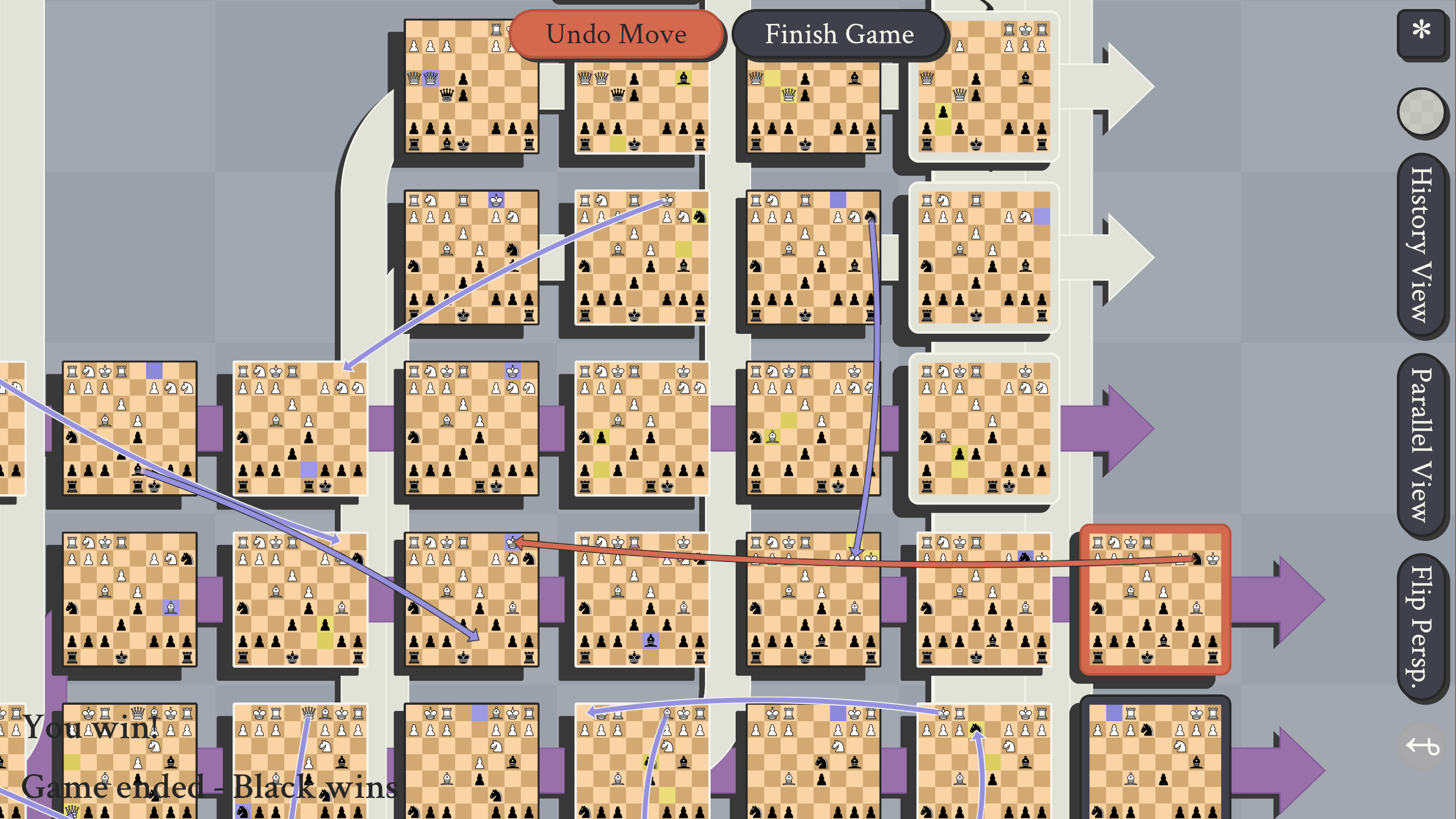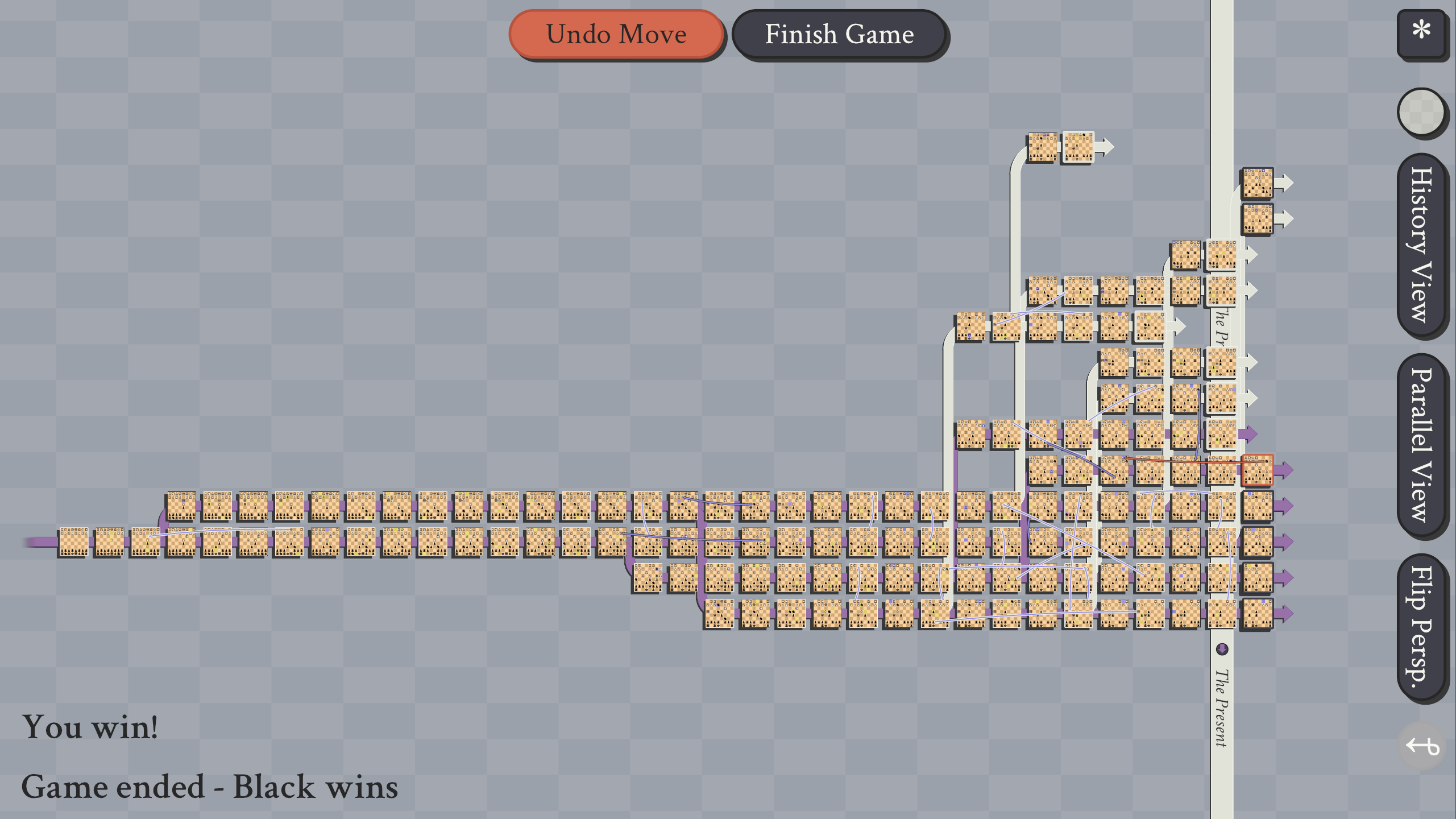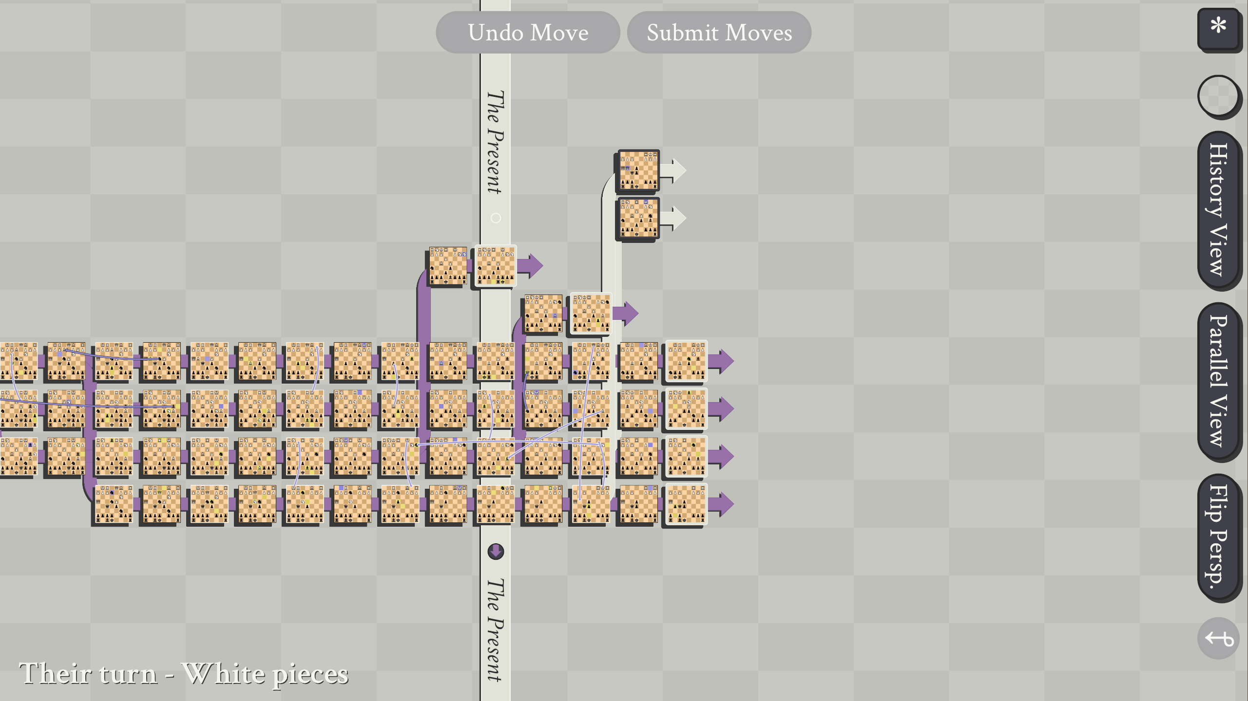 What you are looking at is the timeline of our game. After 3 moves we split into 2 timelines, then were good for a bit. But once we started jumping around things went all sorts of crazy! I am pretty sure there were boards without kings and boards with 2 kings for a while.
